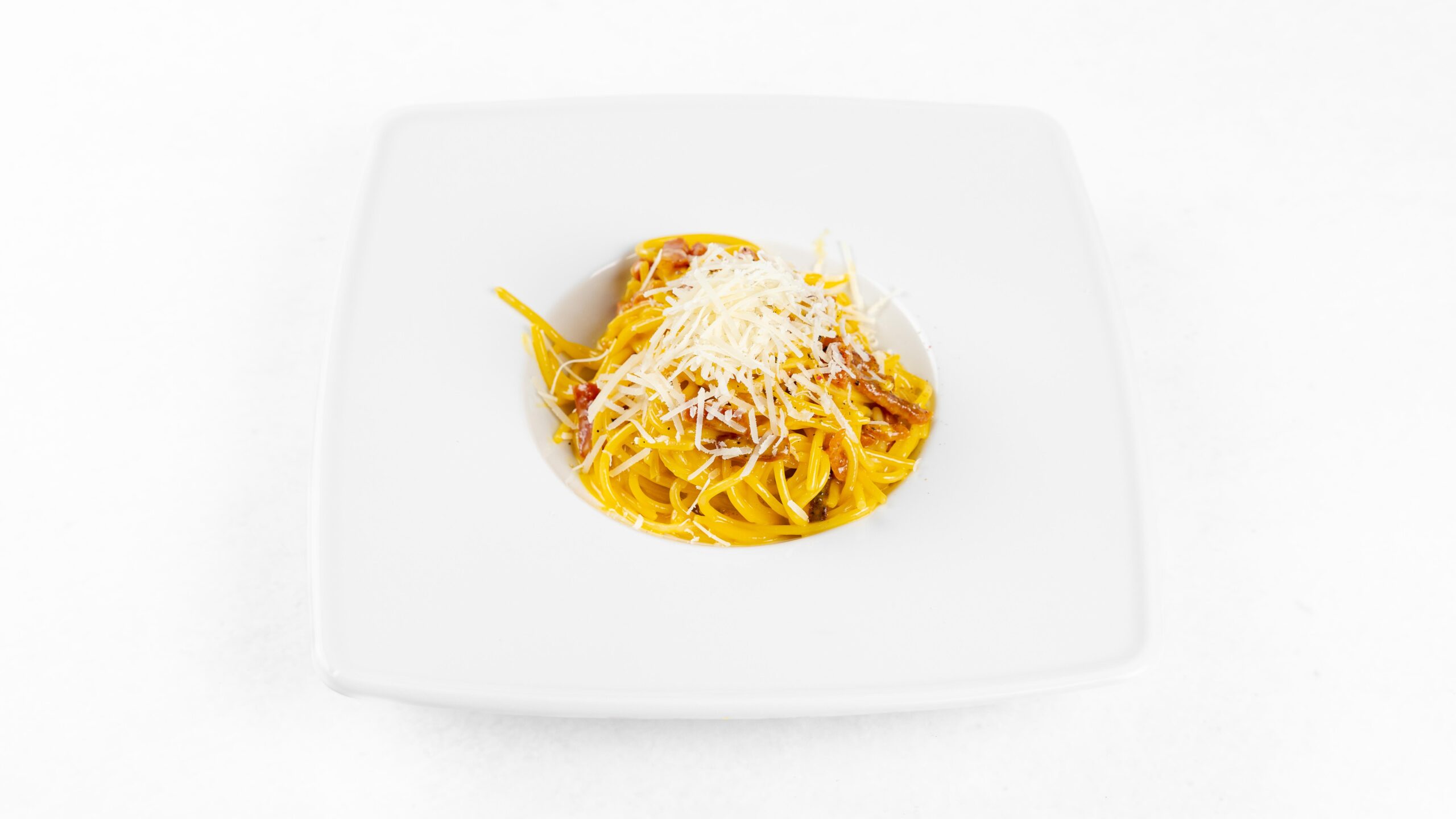 Pasta with egg yolk, guanciale, parmeggiano reggiano, peccorino and black pepper.