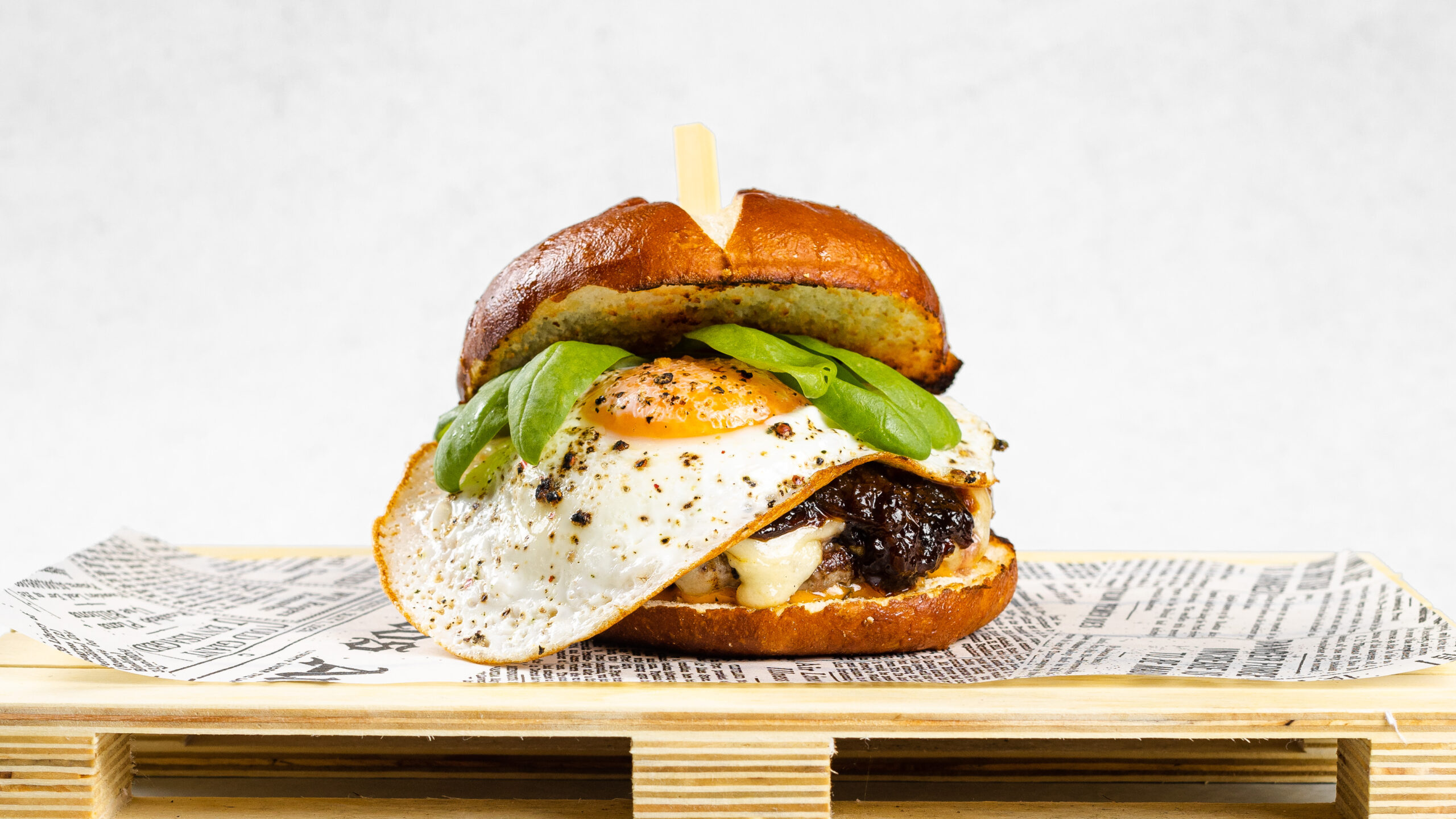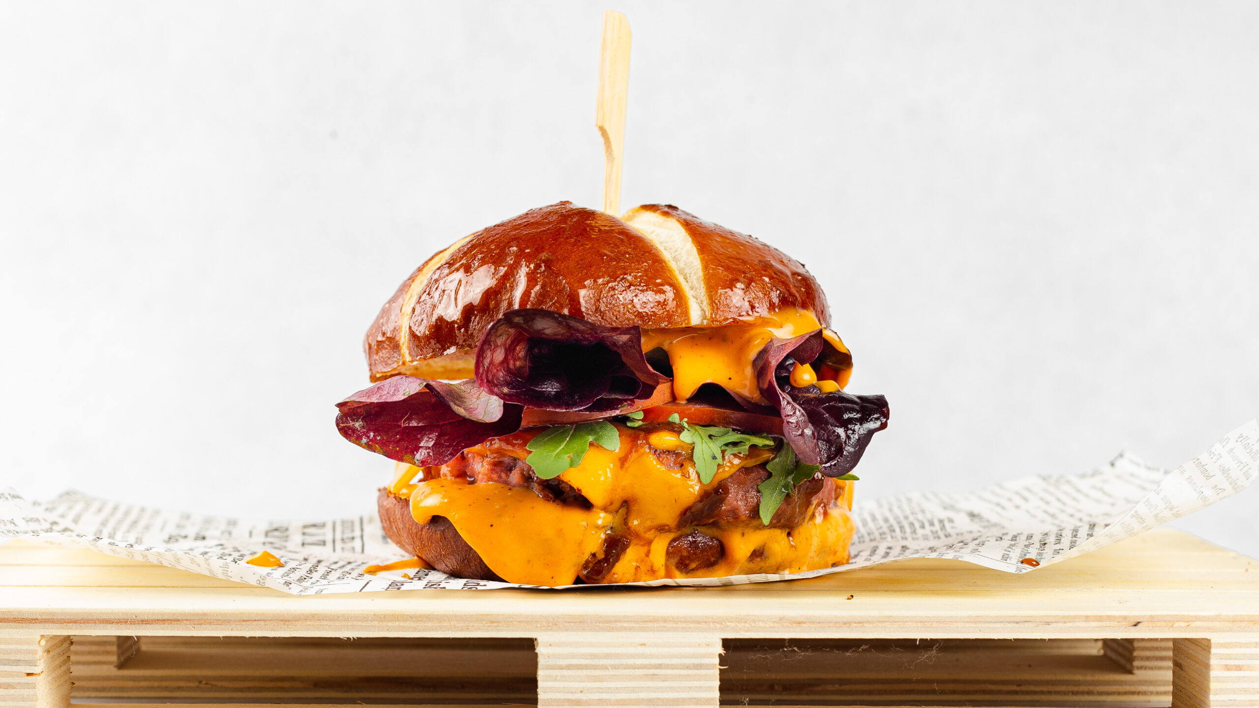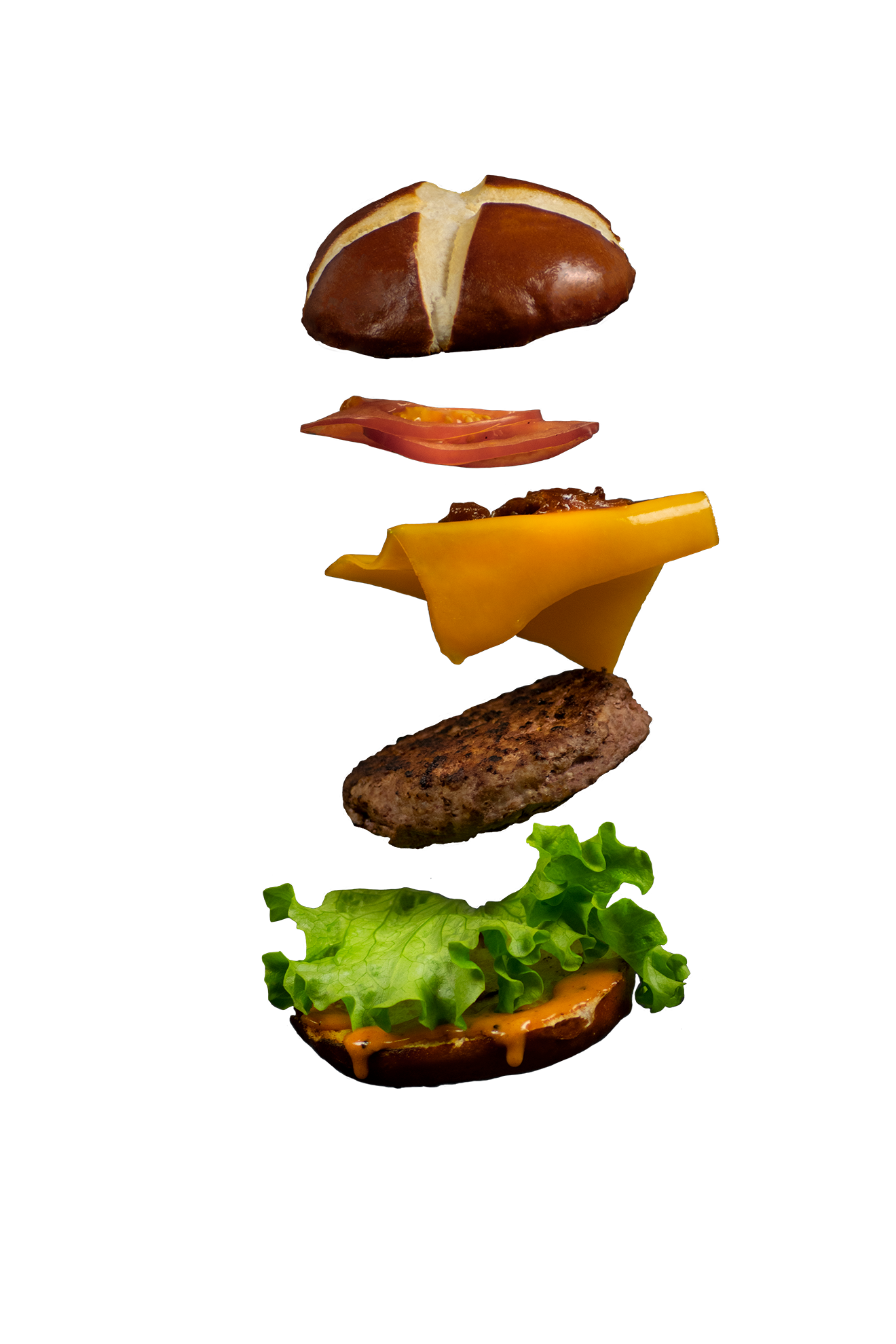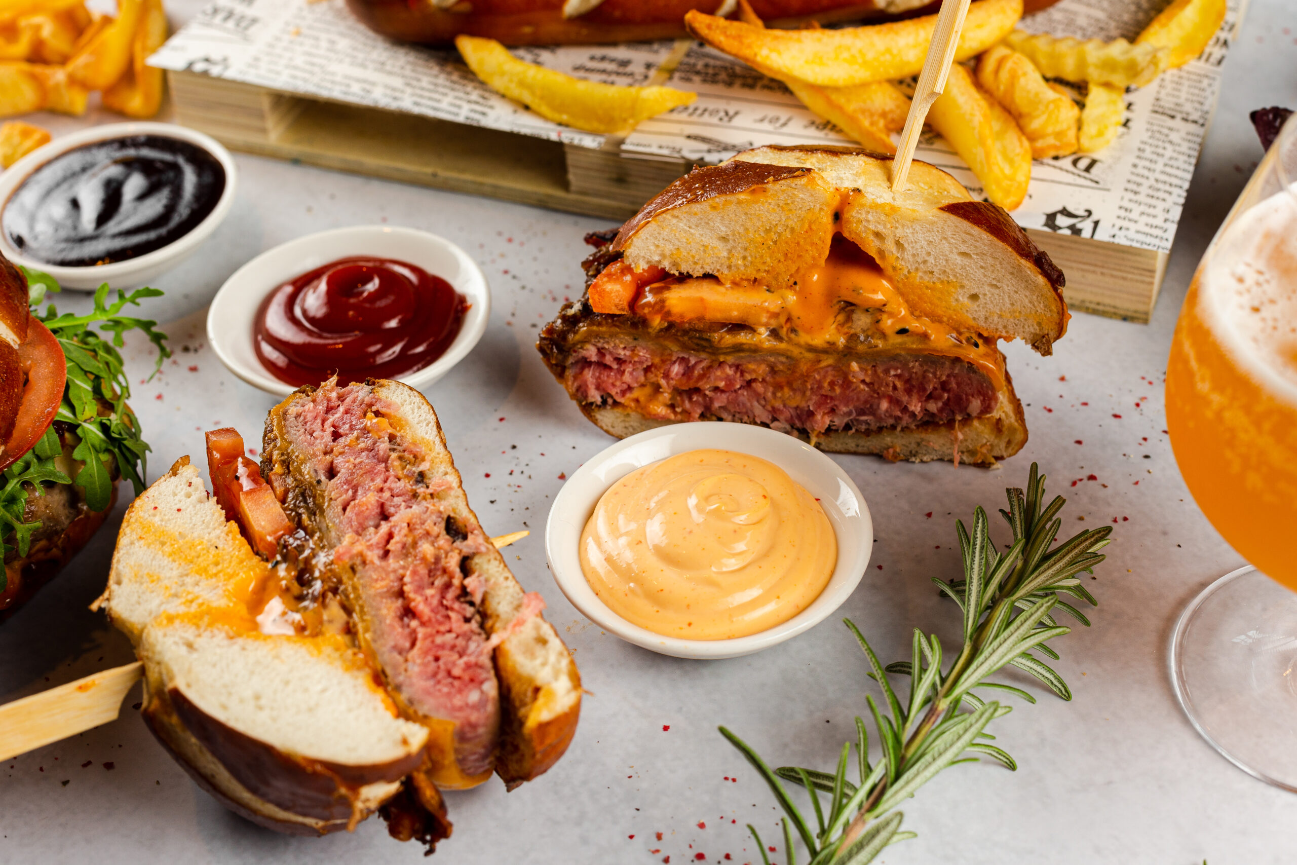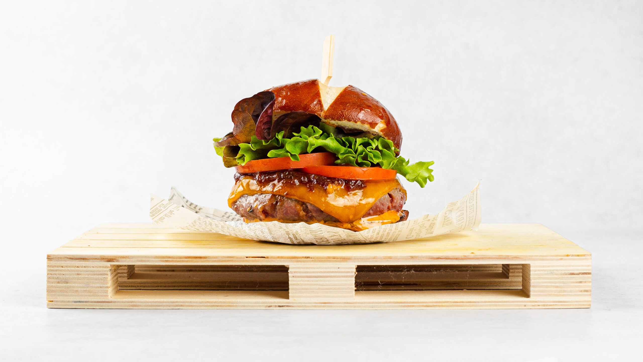 Lye bun, 200g dry-aged black angus beef 45 days, cheddar, tomatoes, lettuce, chef’s sauce.