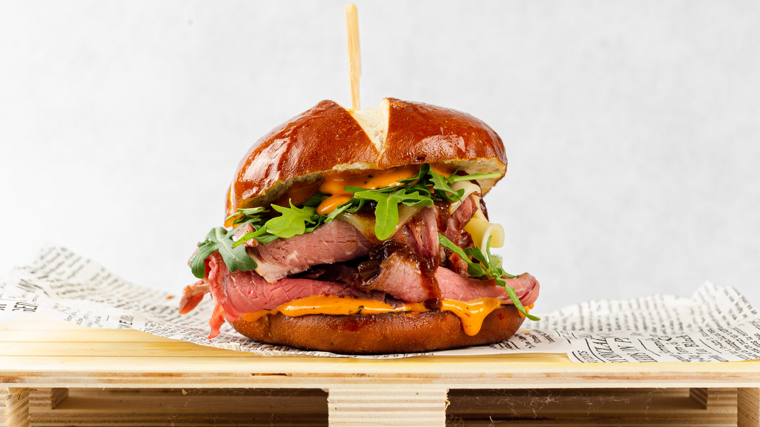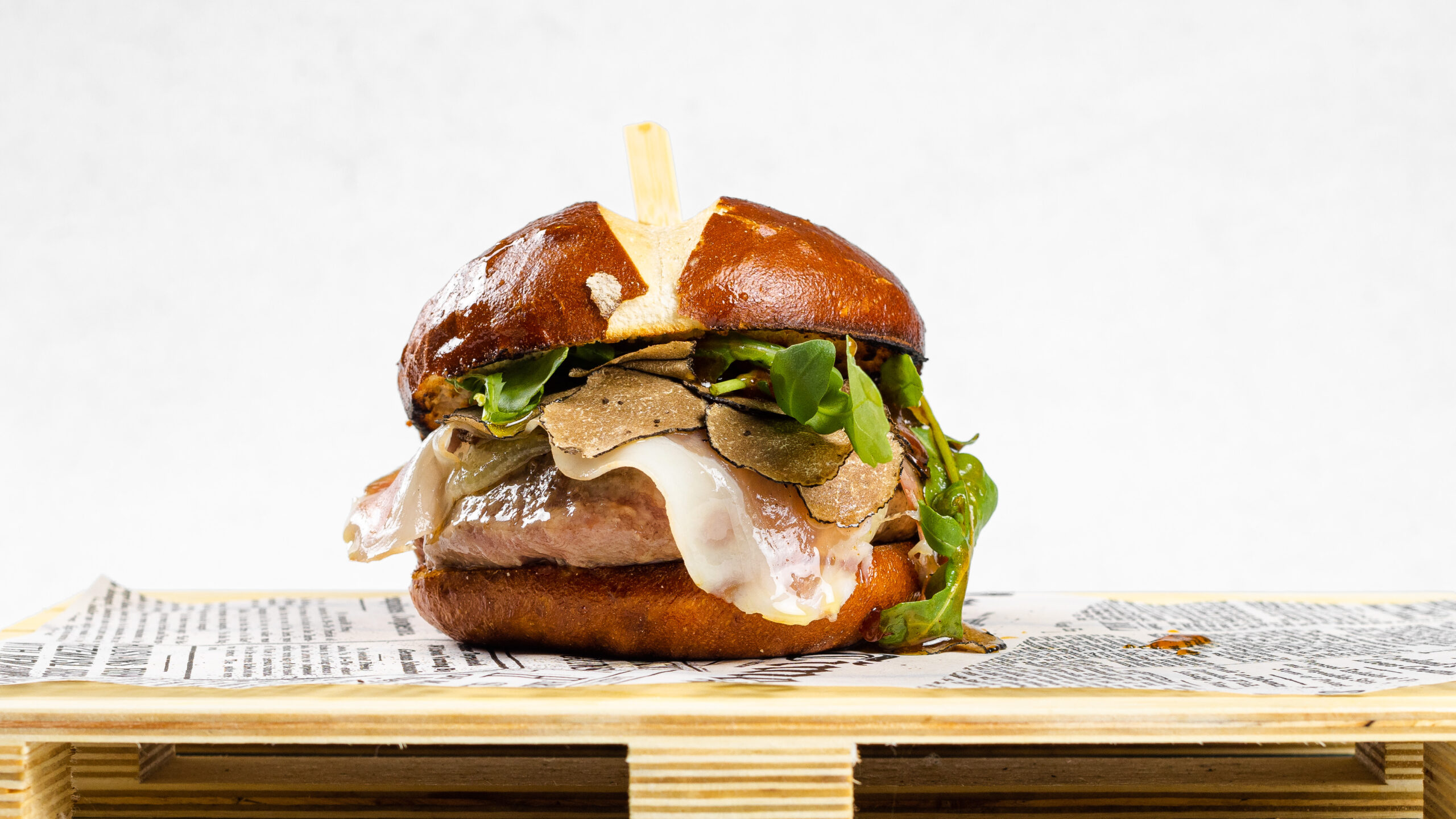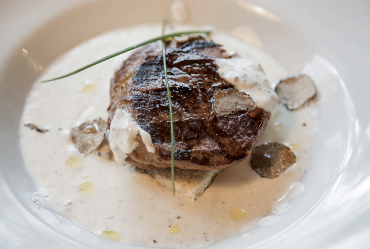 Lye bun,200g dry-aged black angus beef, peccorino, ombolo slices, aragula, fresh truffles, apricot cream, chef’s sauce.