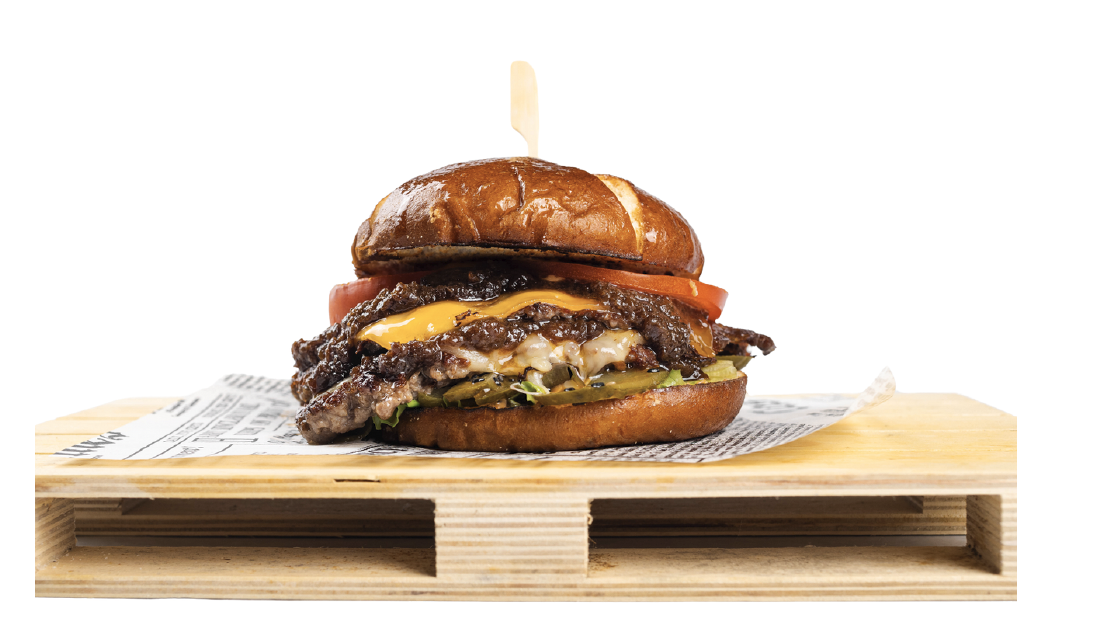 Lye bun,2x90g wet-aged black angus beef, cheddar, gauda, lettuce, yuzu pickles, tomato, chef’s sauce.