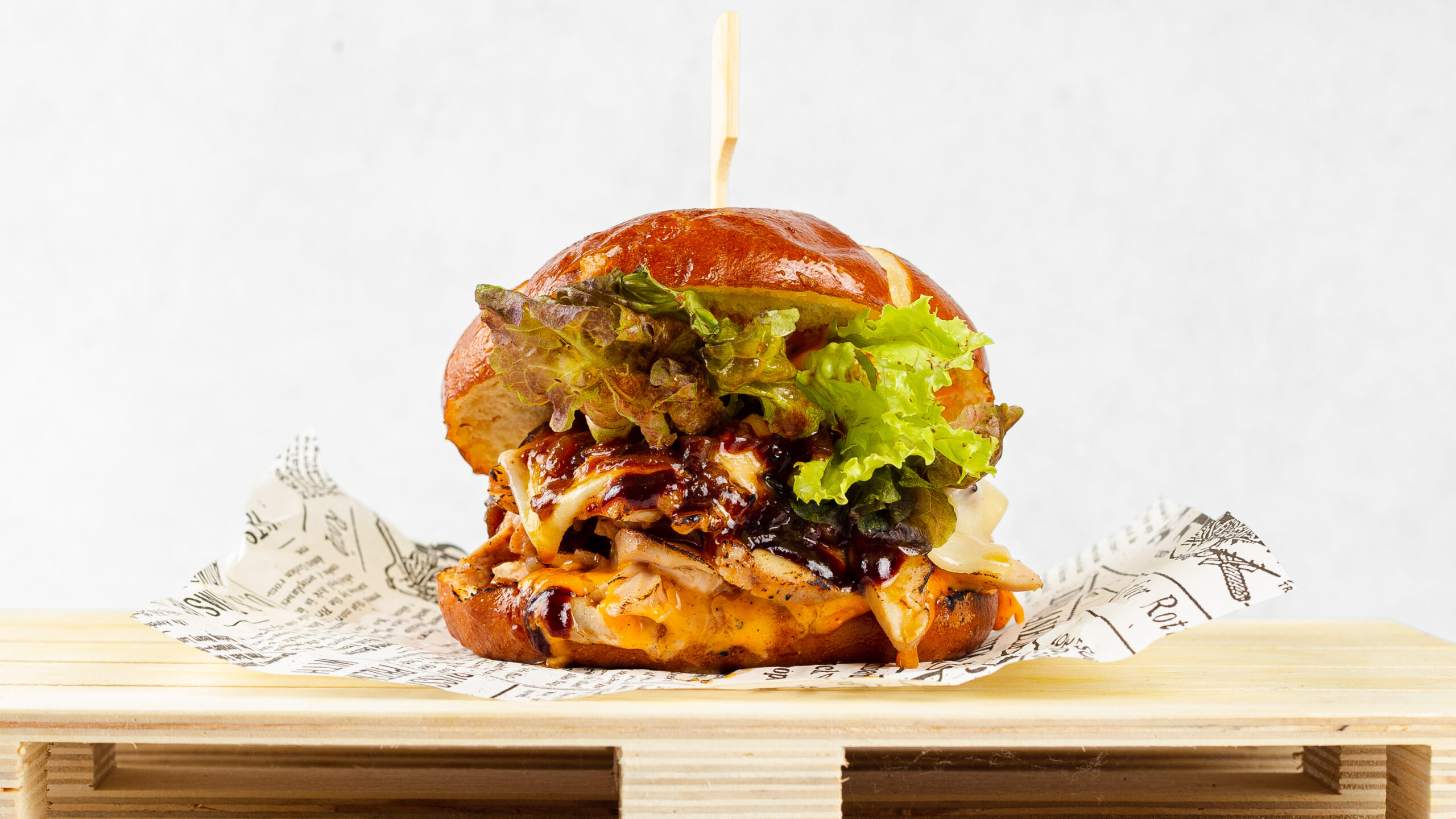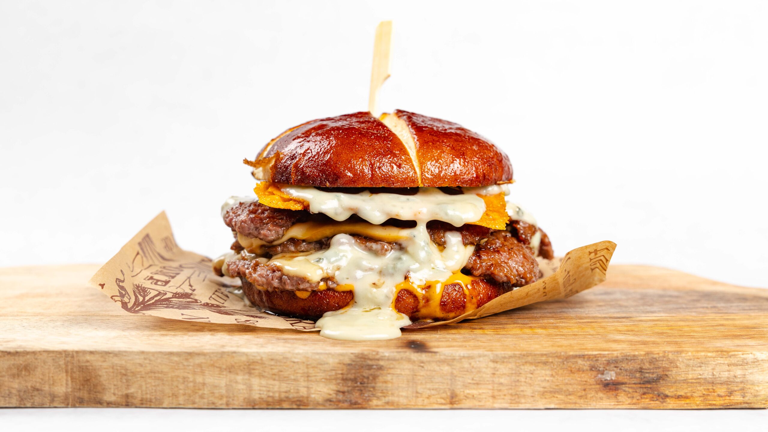 Lye bun, 3x 90g wet-aged black angus beef,bacon wraped in cheddar, smokedgauda, mozarella, creamy gorgonzola dip, chef’s sauce,bbq sauce.