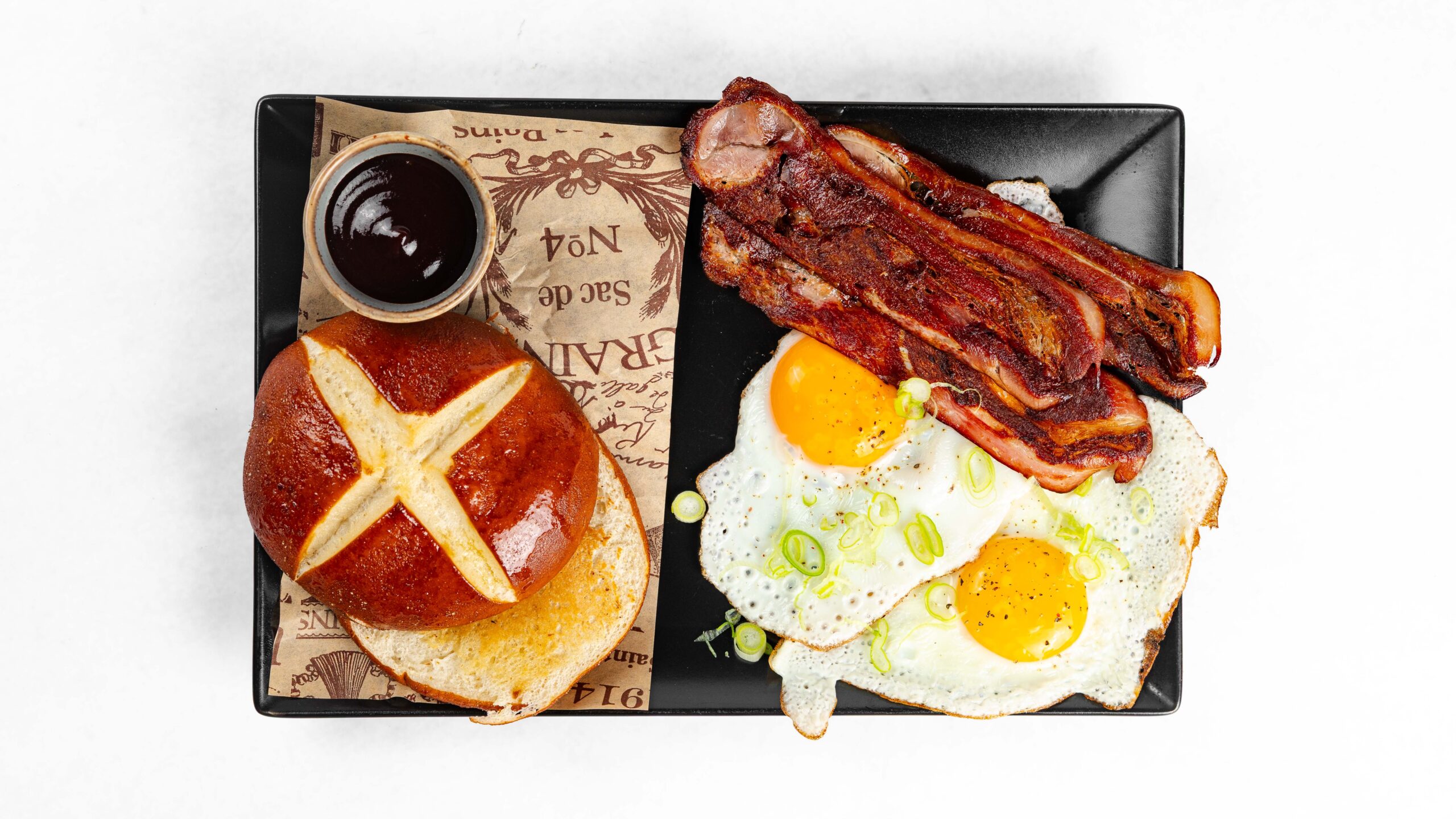 2 Eggs and crunchy bacon , lye bun, with cheese sauce and bbq, spices.