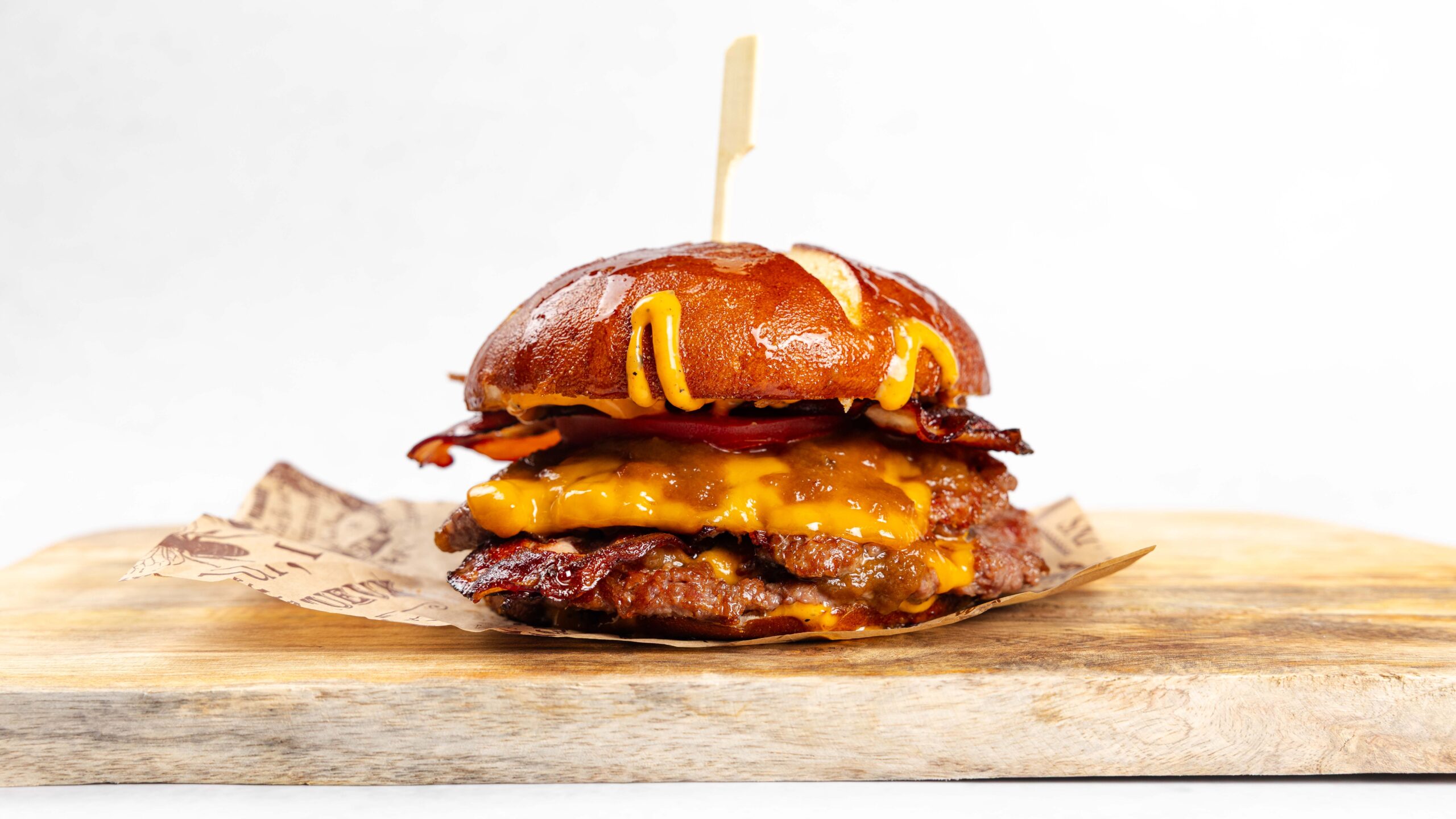 Lye bun, 2x 90g wet-aged black angus beef, cheddar, tomatoes, bacon, caramelized onions, chef’s sauce.